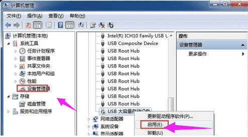 2.进入管理界面后,点击展开“设备管理器”,再点击“通用串行总线控制器”,然后找到被禁用的“大容量储存设置”,再点击“启用”即可。