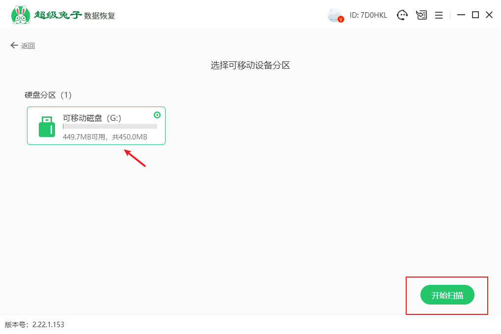 2. 选择插入的可移动设备分区,选好后点击进入“开始扫描”步骤。