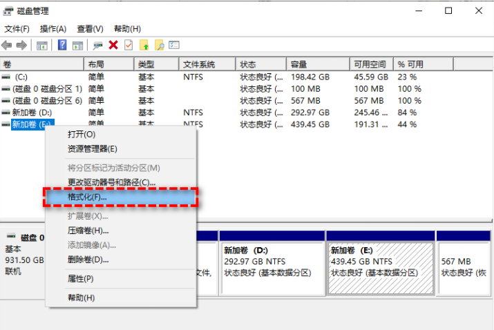 1.进入磁盘管理,选择你需要格式化的硬盘或者分区,右击次硬盘,选择“格式化”。