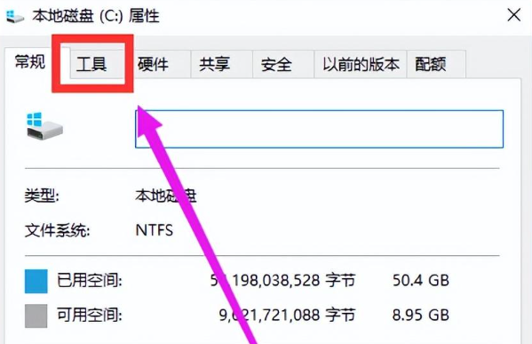 2.进入磁盘属性窗口后,再切换至上面的“工具”。