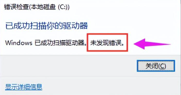 4.接着,磁盘进行“错误检查”的阶段,等扫描检测完毕之后,窗口会提示你磁盘有无错误。