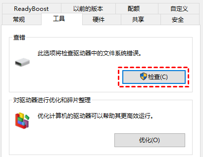 2.切换到“工具”选项卡,然后单击“检查”按钮。系统将自动检查硬盘的错误并尝试修复它们。