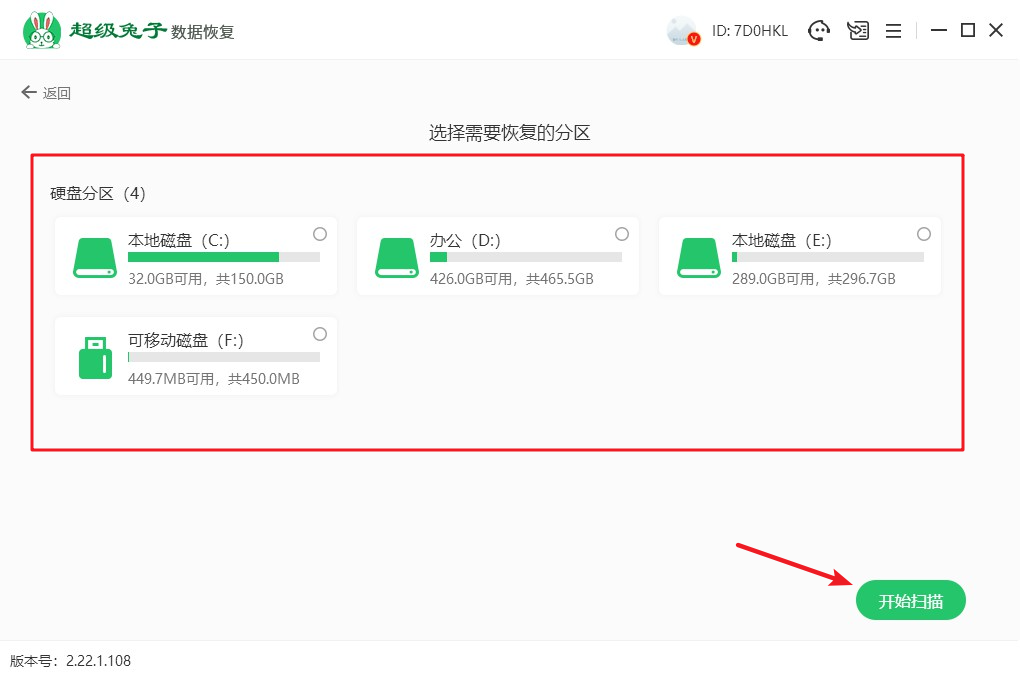 2. 选择文件数据所在的硬盘分区,并点击右下角的“开始扫描”按钮。