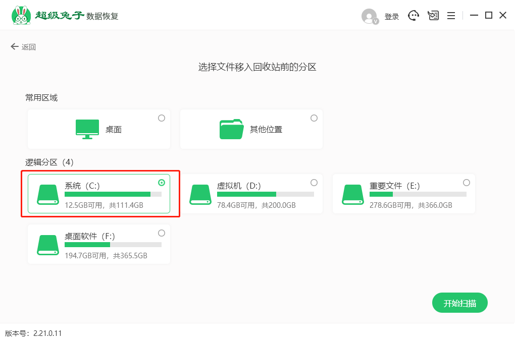 2、选择磁盘或分区(建议根据丢失数据的分区来选择恢复),选定(c盘)磁盘后点击【开始扫描】按钮,即可开始扫描数据。