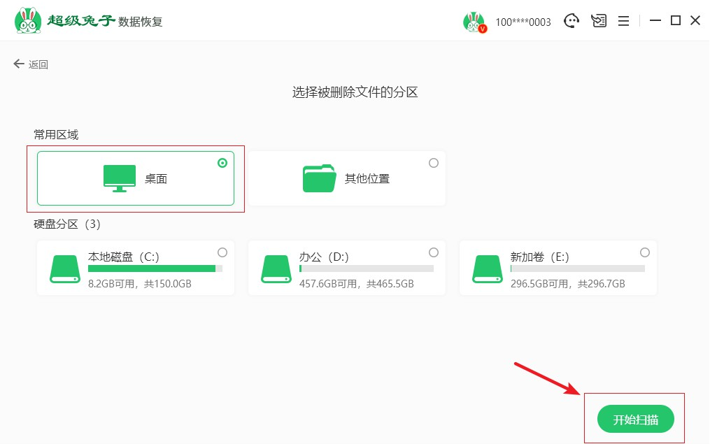 2.根据需要选择被删除文件的分区,这里选择【桌面】为例,完成后点击【开始扫描】。