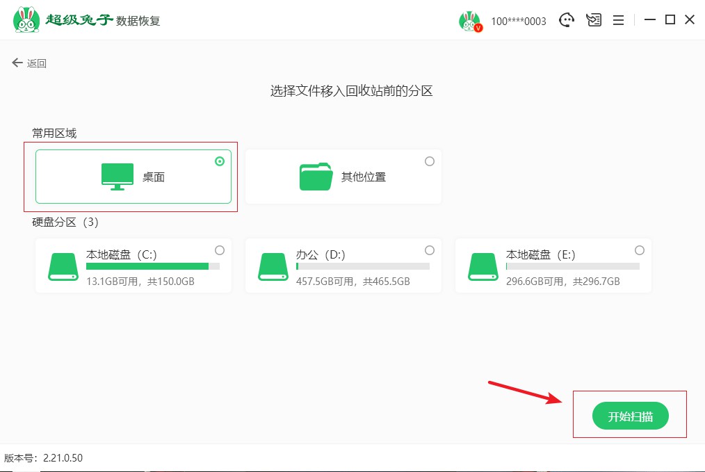 2.根据需要选择被删除文件的分区,这里选择【桌面】,完成后点击【开始扫描】。
