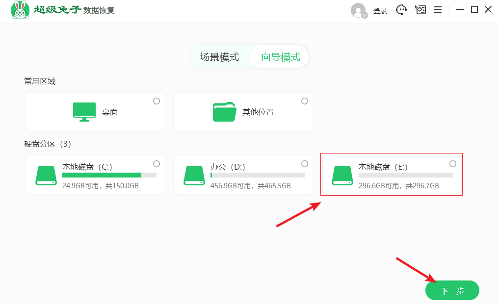 1.打开超级兔子数据恢复,在【向导模式】下选择需要恢复的电脑硬盘,点击【下一步】。