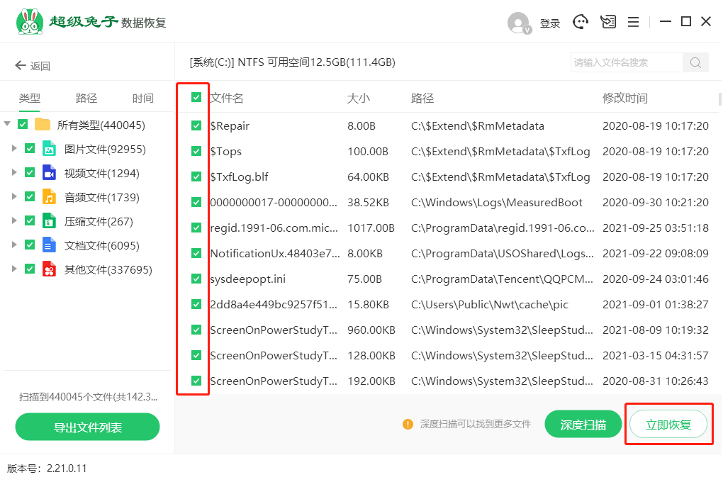 4、扫描完成后,把需要恢复的文件勾选上,再点击右下角底部【立即恢复】按钮,把数据另存为到其他的磁盘即可。