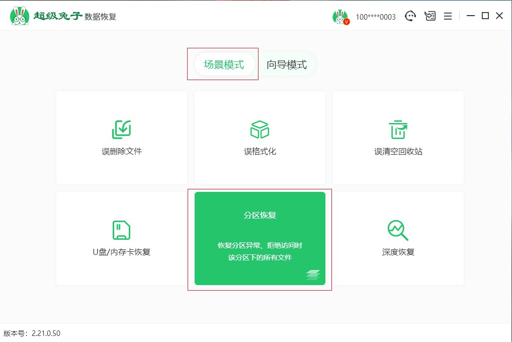 第一步:打开超级兔子数据恢复,在“场景模式”下选择“分区恢复”。