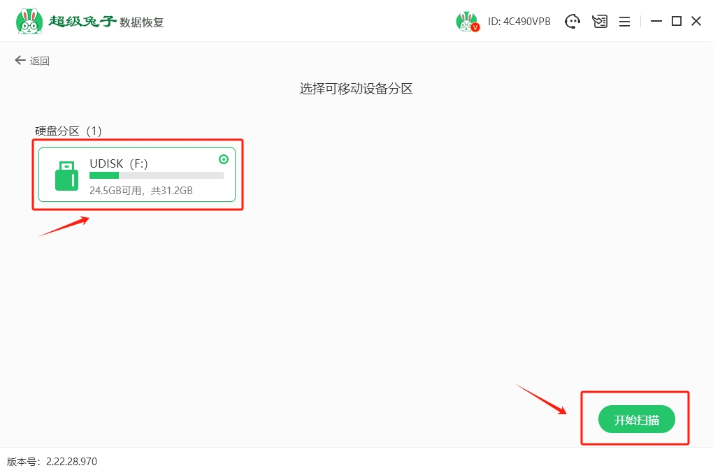 2.找到你的U盘,点击“开始扫描”,让超级兔子自动帮你扫描数据,轻松找回丢失的文件。