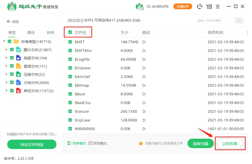 3.当前超级兔子正在对您的硬盘进行详细扫描,过程可能需要一些时间。等扫描结束后,您可以挑选需要恢复的文件,点击“立即恢复”完成恢复。