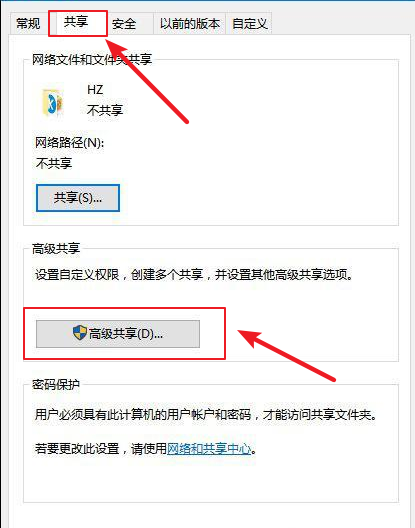 2.在属性中把上方的选项卡切换到【共享】,接着点击【高级共享】。
