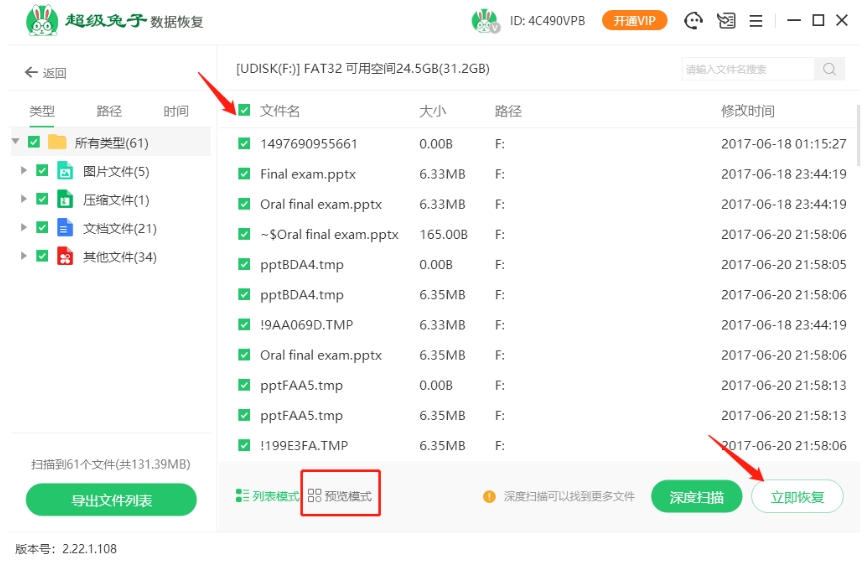 4.扫描结束后,点击“预览模式”查看所有恢复的文件,挑选您需要的文件,点击“立即恢复”按钮,数据就能被恢复了。