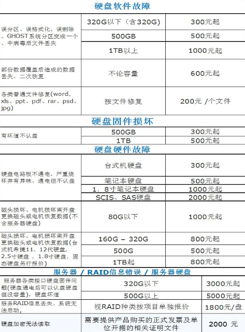 电脑硬盘恢复机构报价(只做参考,以硬盘实际情况为准)