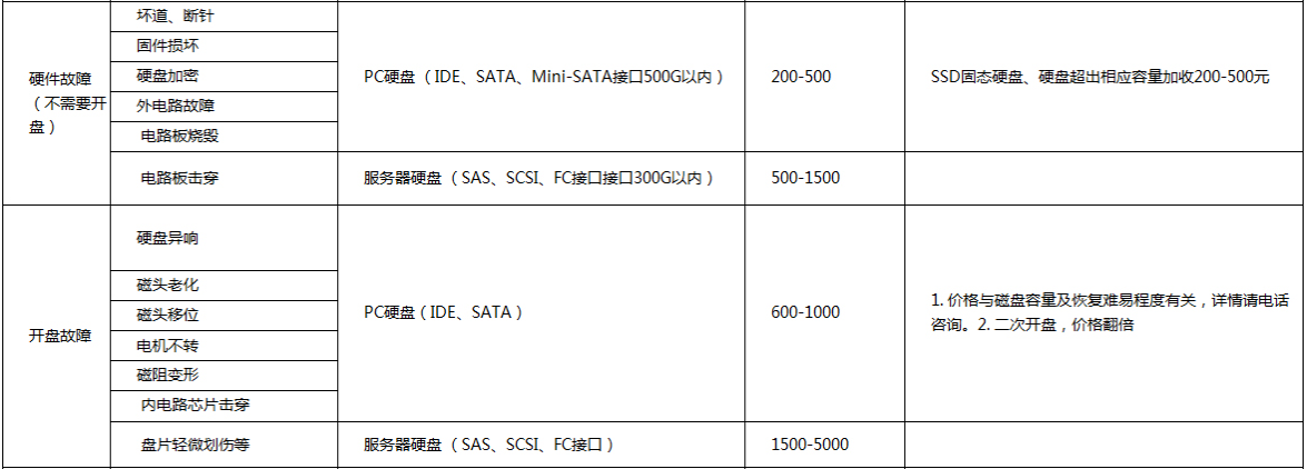 硬盘硬件故障数据恢复价格表