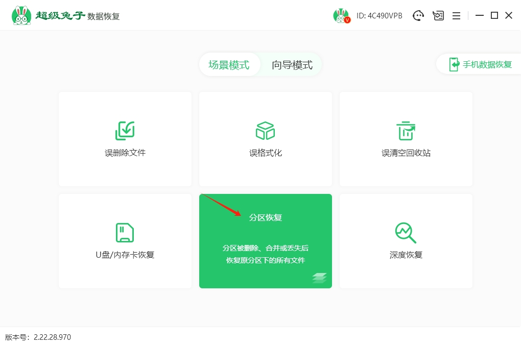 1.通过官方网站下载安装“超级兔子数据恢复”,并保存至桌面。启动程序后,选择“场景模式”并点击“分区恢复”开始恢复丢失的数据。