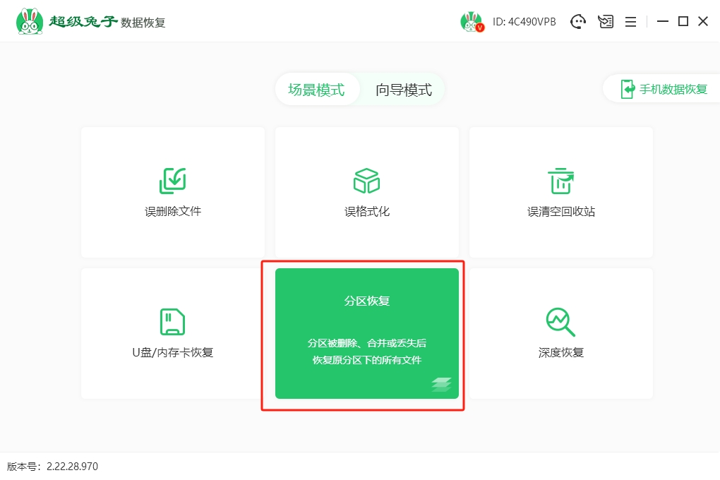 1.在桌面上下载安装并运行“超级兔子数据恢复”,进入“场景模式”后,点击“分区恢复”选项,准备恢复硬盘数据。