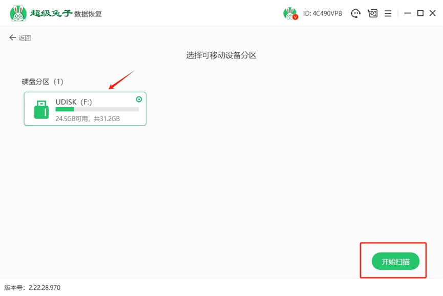 2.选中您的内存卡后,点击“开始扫描”,超级兔子将自动启动扫描过程,以恢复丢失的数据。