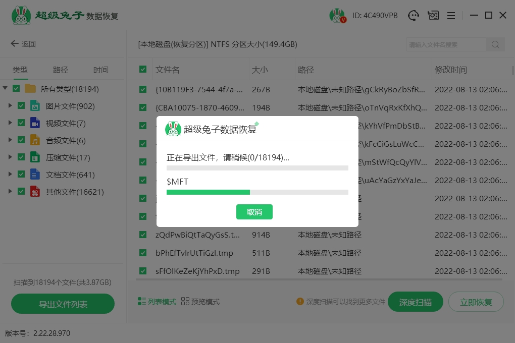 3.这时超级兔子正在对硬盘进行扫描,请您耐心等待。扫描结束后,您就可以从扫描结果中选取文件,点击“立即恢复”来完成恢复。