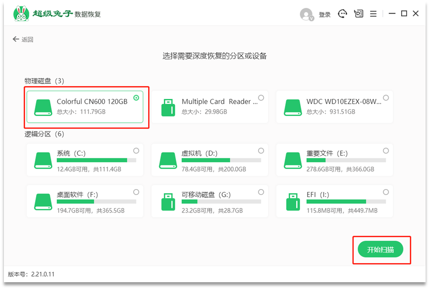 2、选择整个硬盘或单个分区(建议根据丢失数据的分区来选择恢复,整个硬盘扫描用时比较长不建议使用),选定(固态硬盘/120GB)磁盘后点击【开始扫描】按钮,即可开始扫描数据。