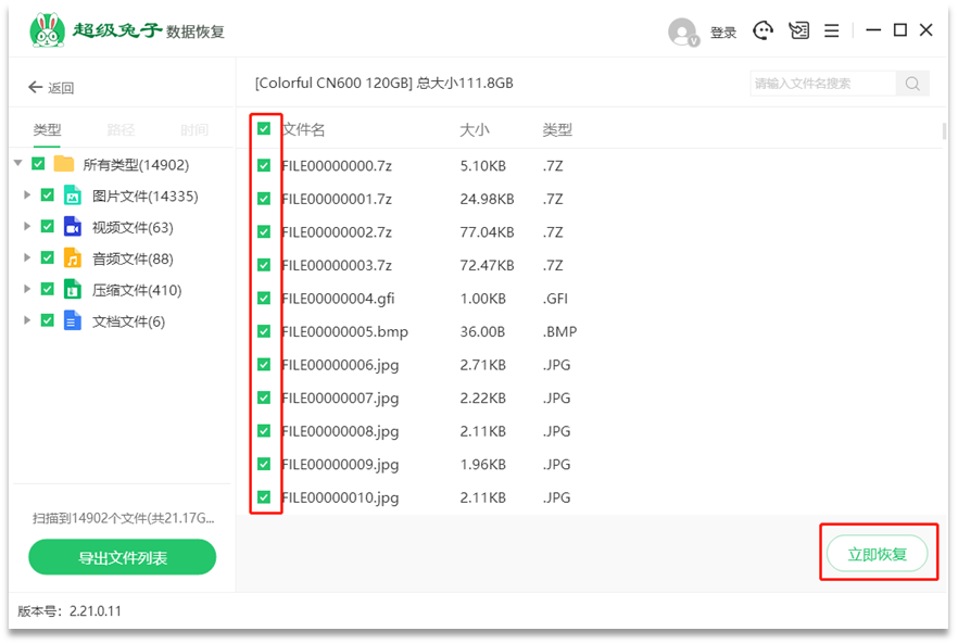 4、扫描完成后,把需要恢复的文件勾选上,再点击右下角底部【立即恢复】按钮,把数据另存为到其他的磁盘即可。特别提示:数据恢复必须把当前恢复的数据存储到其他盘中,避免前后数据再次被2次覆盖破坏)