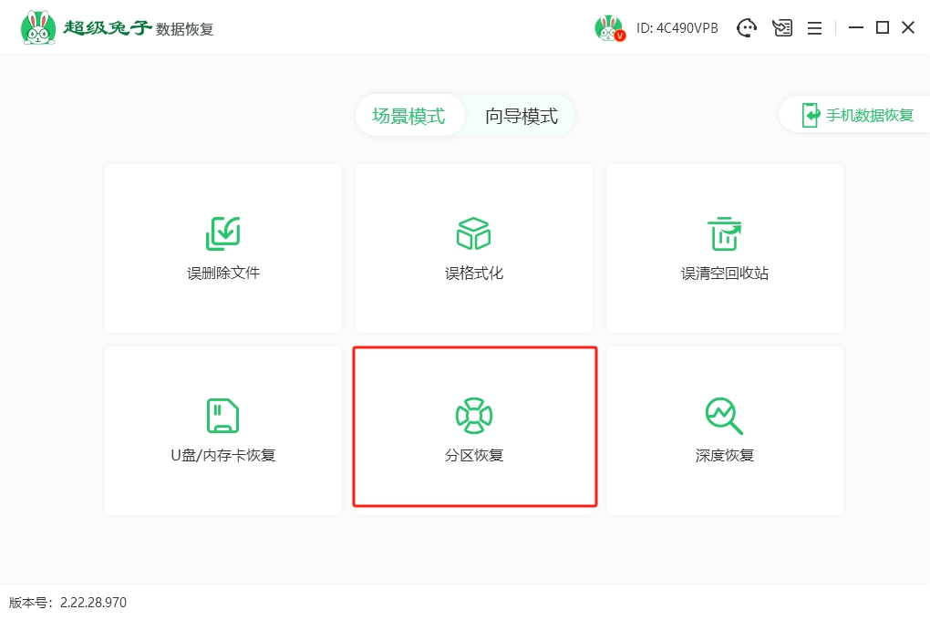 1.双击桌面上的“超级兔子数据恢复”,进入后选择“场景模式”,点击“分区恢复”,把丢失的数据恢复回来。