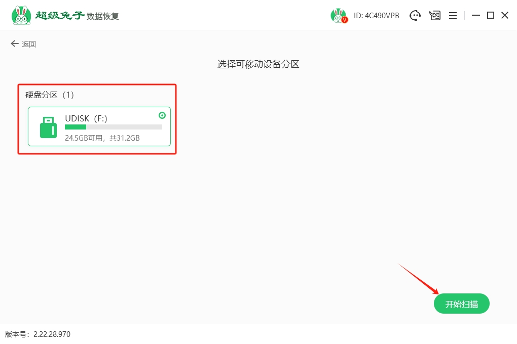 2.在设备列表中选中您需要恢复数据的内存卡,点击后按“开始扫描”。软件会随即启动数据扫描。