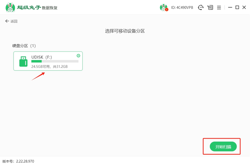 2.确认目标内存卡后,按“开始扫描”,超级兔子会立刻进行扫描,把丢失的文件列出来供恢复。