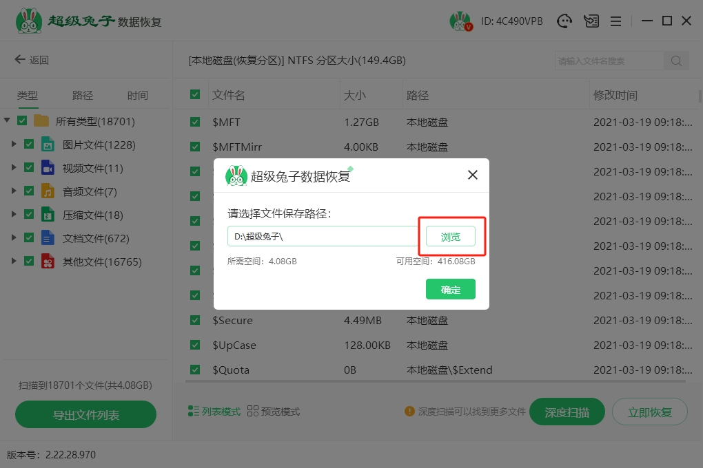 4.在保存恢复文件时,别忘了点击“浏览”按钮,选择一个新的存储位置。千万不要把文件恢复到原来的磁盘,系统会自动在你选的路径下创建一个名为“超级兔子”的文件夹,用来存放恢复的文件。