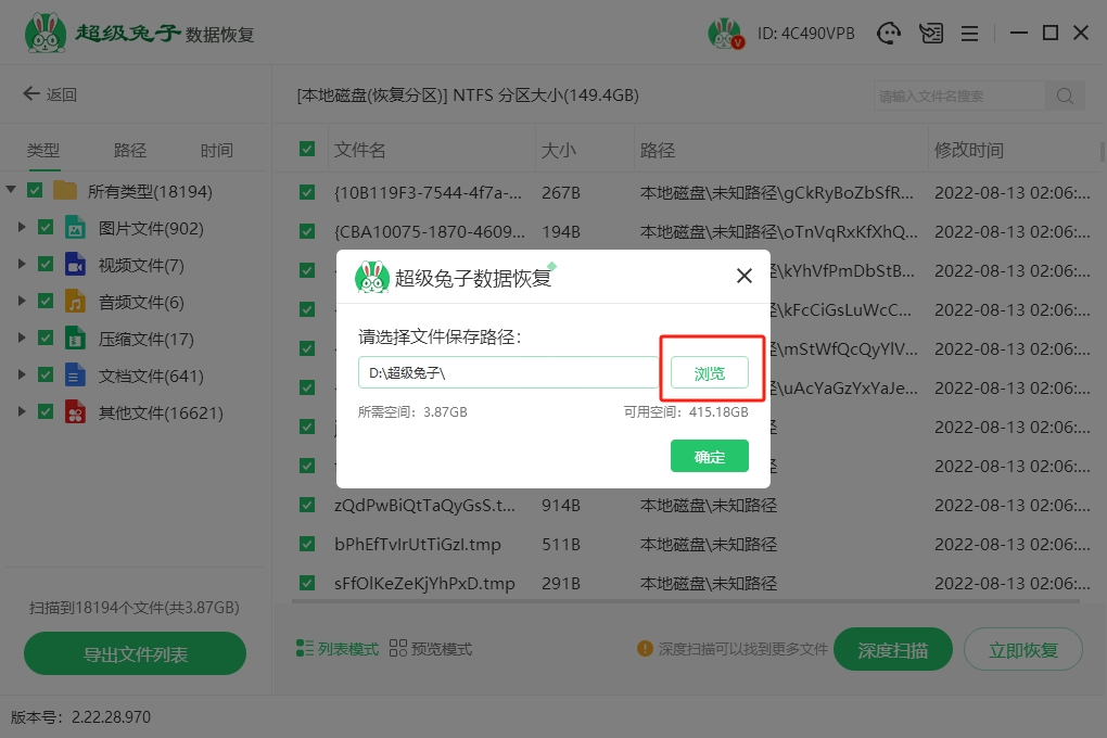 4.恢复文件的时候记得点“浏览”,选一个新地方存,不要放回原来的盘,系统会自动建个“超级兔子”的文件夹来装这些文件。