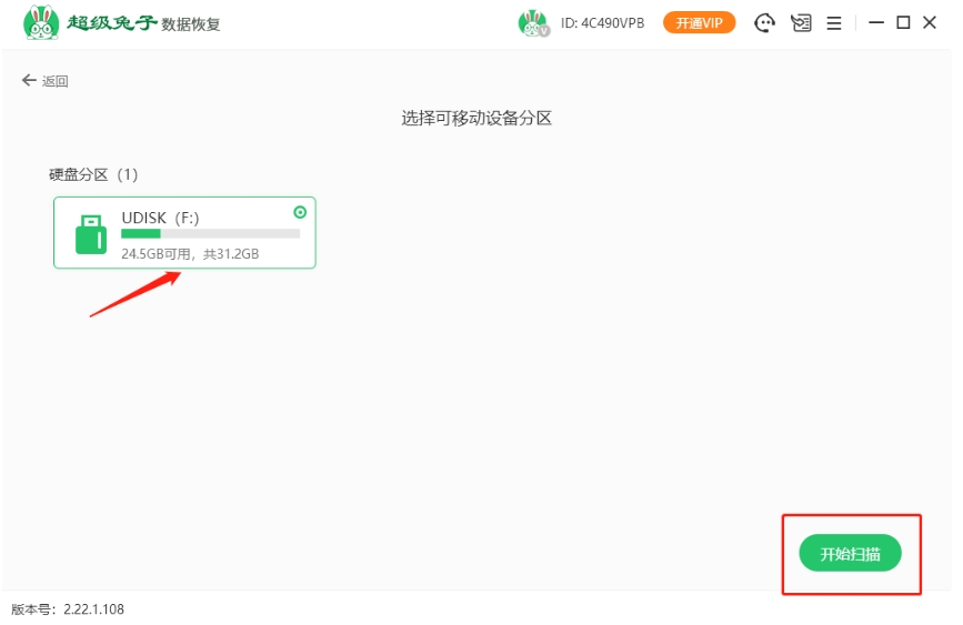 2.选定要恢复的U盘分区后,点击“开始扫描”,超级兔子就会自动进行扫描,查找丢失的文件内容。
