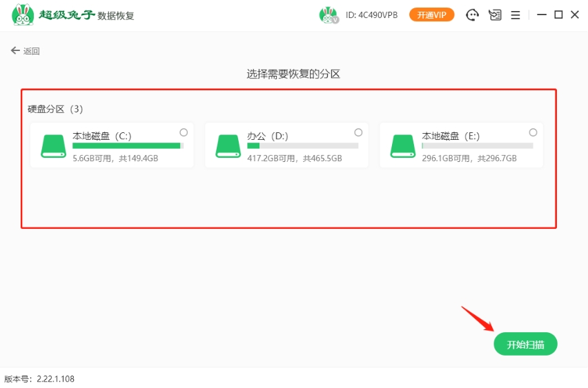 2.选中目标分区后按下“开始扫描”,超级兔子就会启动扫描流程,把还能恢复的文件内容找出来。