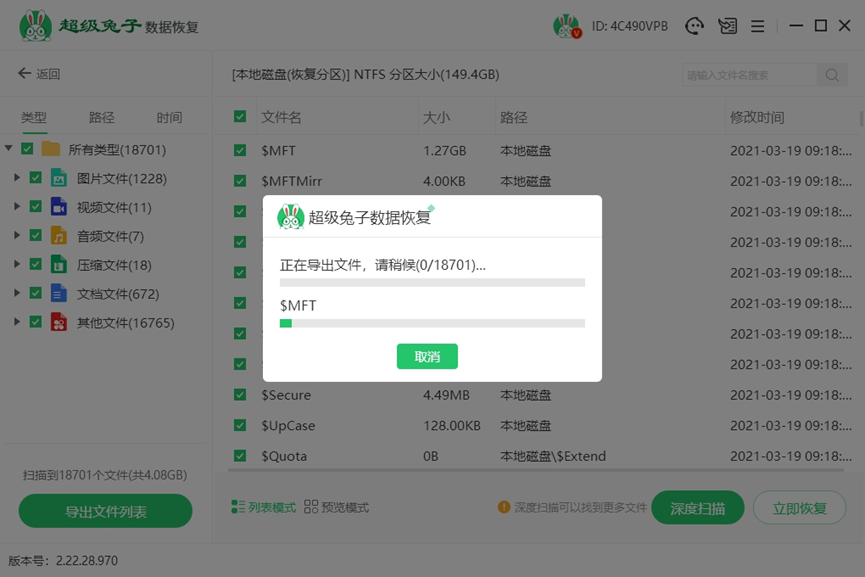 3扫描阶段建议不要操作电脑,等进度结束后,从扫描结果中选中目标文件,最后按下“立即恢复”。
