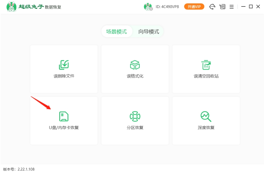 1.打开超级兔子数据恢复后,在界面中找到“场景模式”,点击进入并选中“U盘/内存卡恢复”,软件随即会对设备进行扫描和恢复。