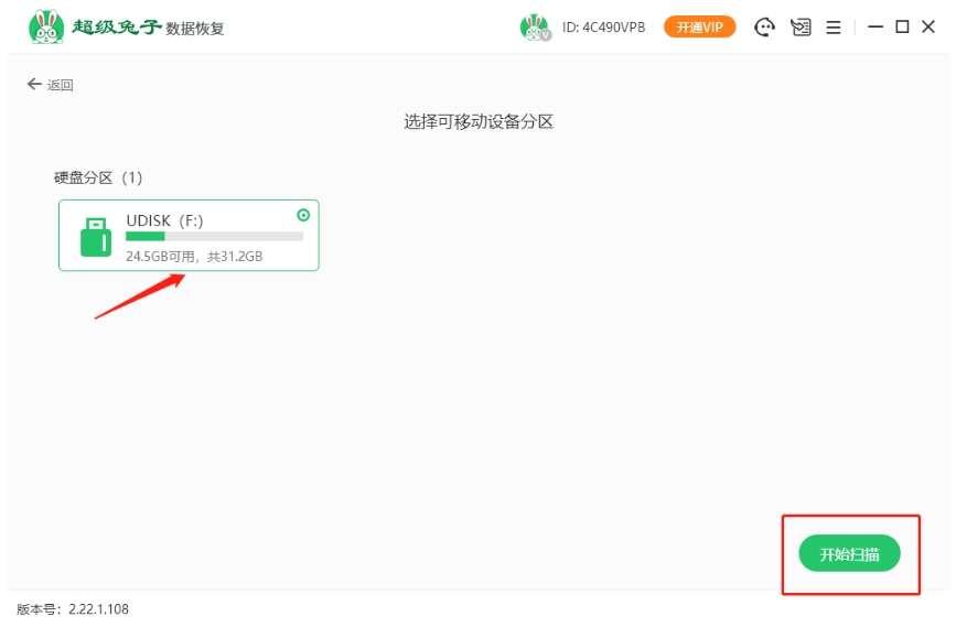 2.一旦确定好要恢复的U盘分区,就点击“开始扫描”,超级兔子将开始自动扫描,帮助你找回丢失的文件。