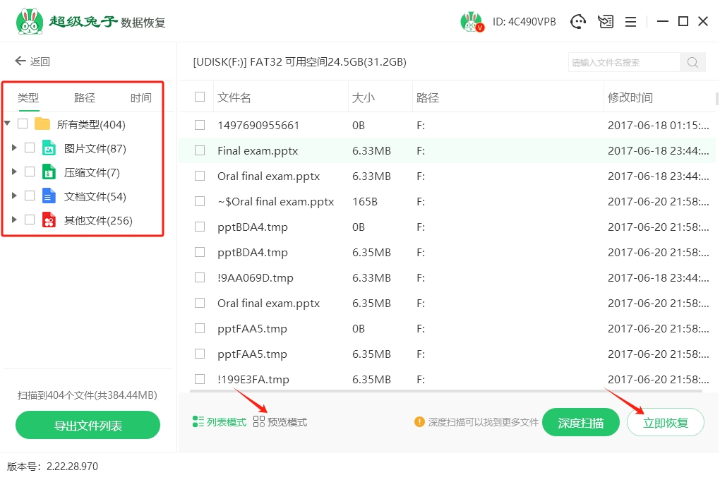 4.当扫描结束后,您可以通过“预览模式”查看所有扫描到的文件,选择想恢复的文件,点击“立即恢复”来恢复数据。