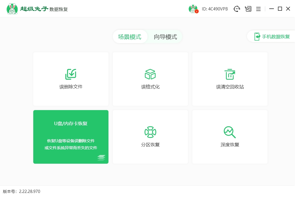 1.启动超级兔子数据恢复后,在首页找到“场景模式”,点选“U 盘/内存卡恢复”,程序会自动进入扫描恢复流程。