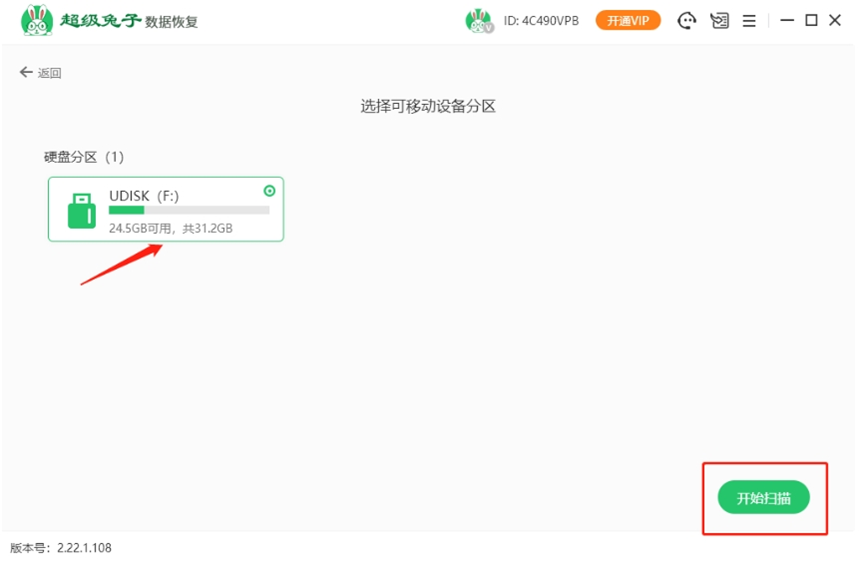 2.在选定了U盘分区后,点击“开始扫描”,超级兔子将会对U盘进行全面扫描,帮助你找回丢失的文件。