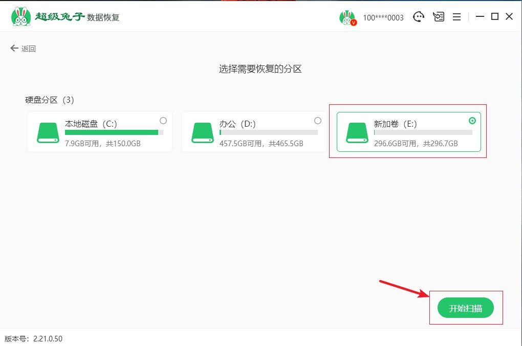 第二步:选择需要恢复的分区,这里以选择“E盘”为例,完成后点击“开始扫描”。