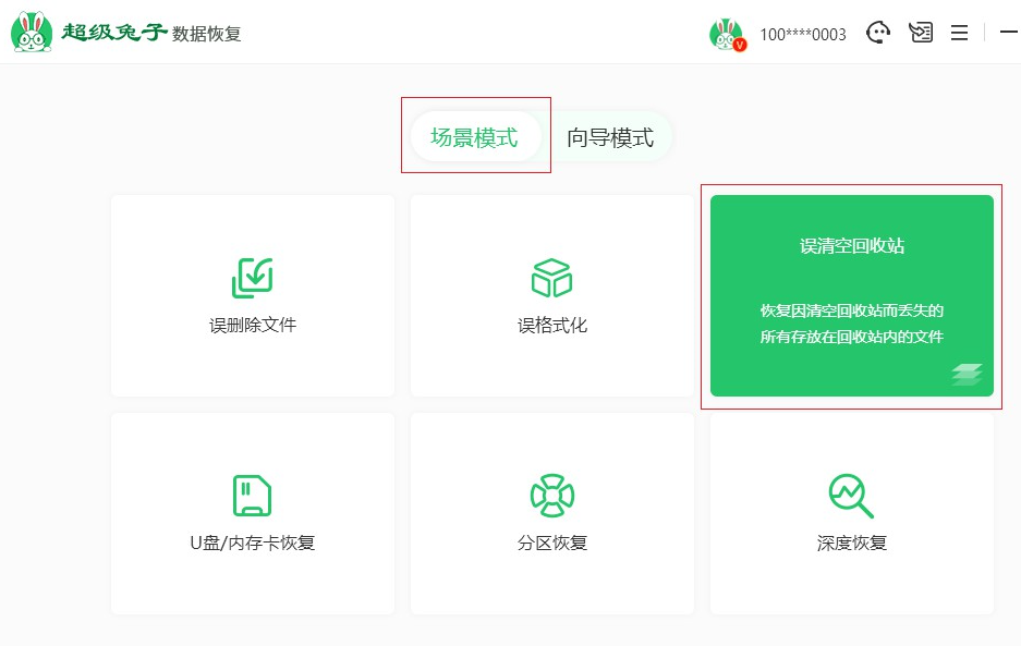 1.在桌面打开超级兔子数据恢复,在【场景模式】下选择【误清空回收站】。