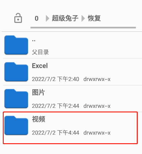 5.根据超级兔子APP指引,依次点击打开文件管理器→超级兔子→恢复→视频。