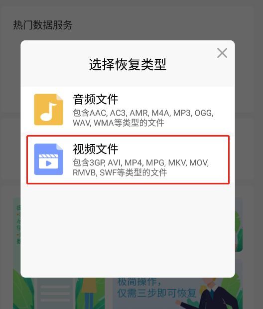 2.这一步来到选择恢复类型,可根据自己需求点击选择视频文件恢复。超级兔子支持恢复多种常见的视频文件格式,例如MP4,RMVB等等。