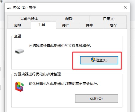 2.进入后,上方选项卡切换到【工具】,然后点击【检查】,然后电脑就会开始自动扫描和修复硬盘。