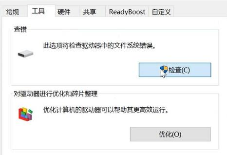 2.在属性页面中选择“工具”项,并点击页面右侧的“检查”按钮自动检查修复。