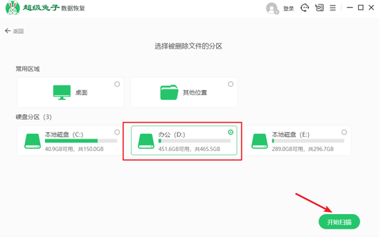 2.接着选择需要恢复的数据之前所在的分区,然后点击“开始扫描”。(这里选择D盘)